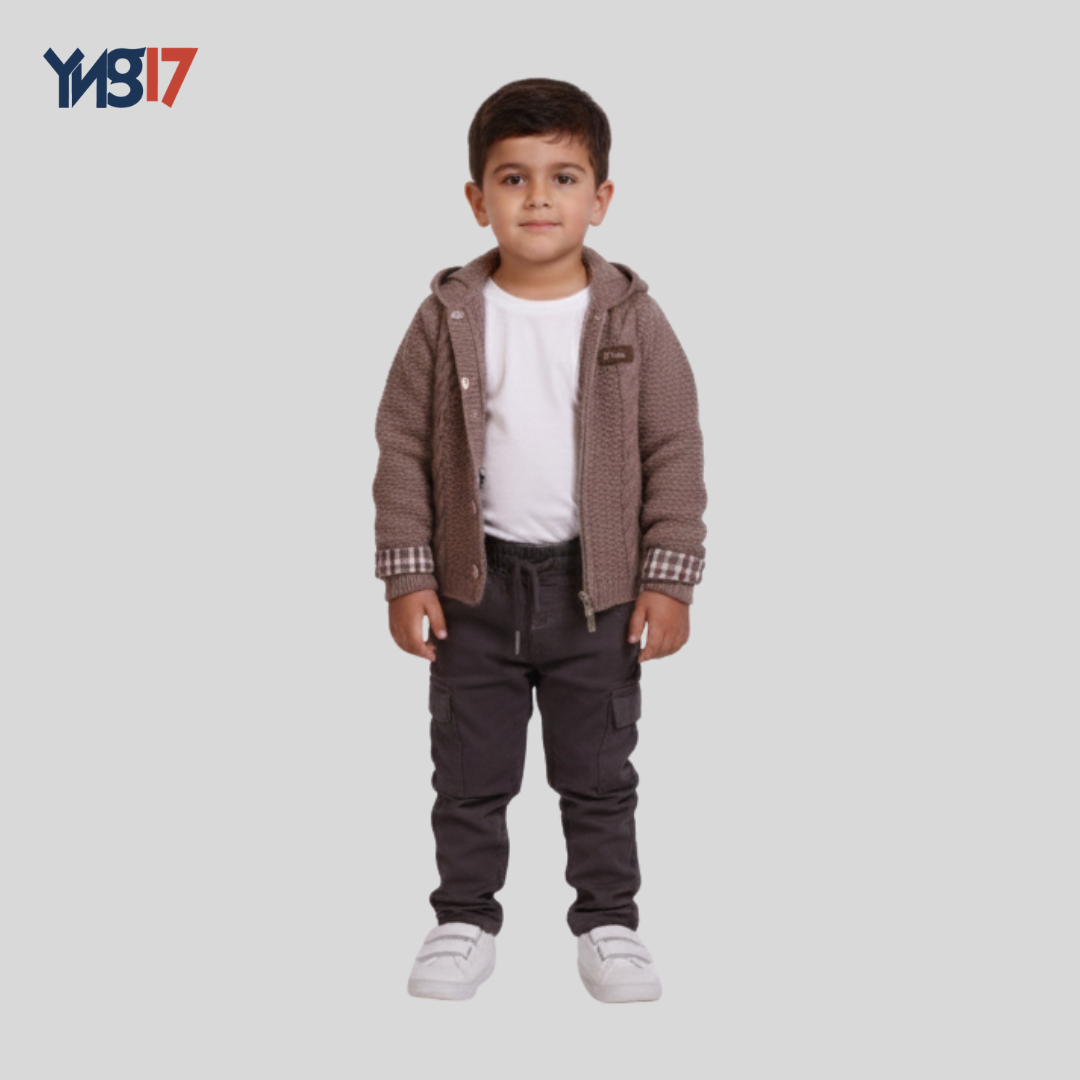 An elegant winter kids’ 3-piece outfit set that blends warmth, practicality, and classic style. The set includes a knitted hooded cardigan with front buttons, a classic plaid inner shirt, and comfortable cargo pants with side pockets and an elastic waistband.
