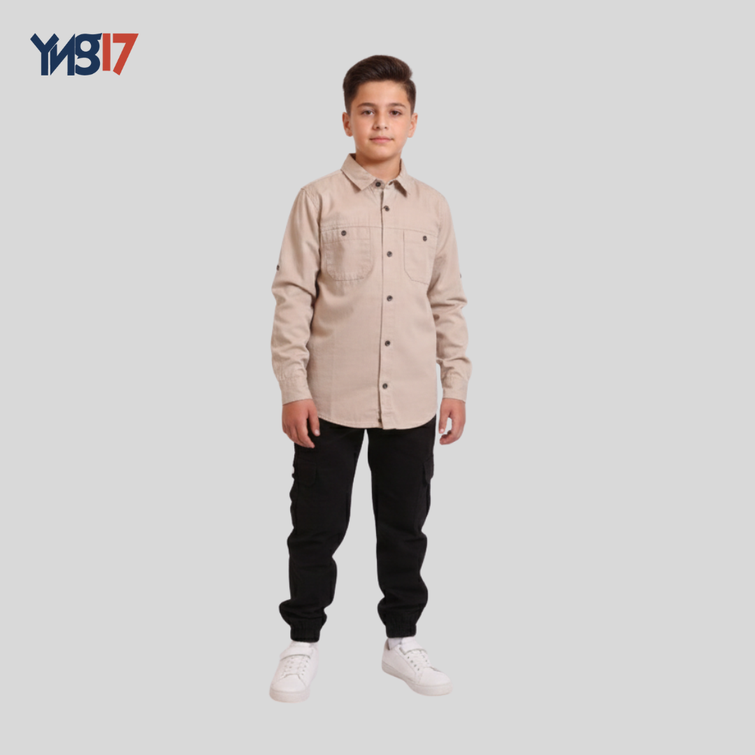A kids beige cotton shirt with a clean classic design that combines elegance and comforte.
