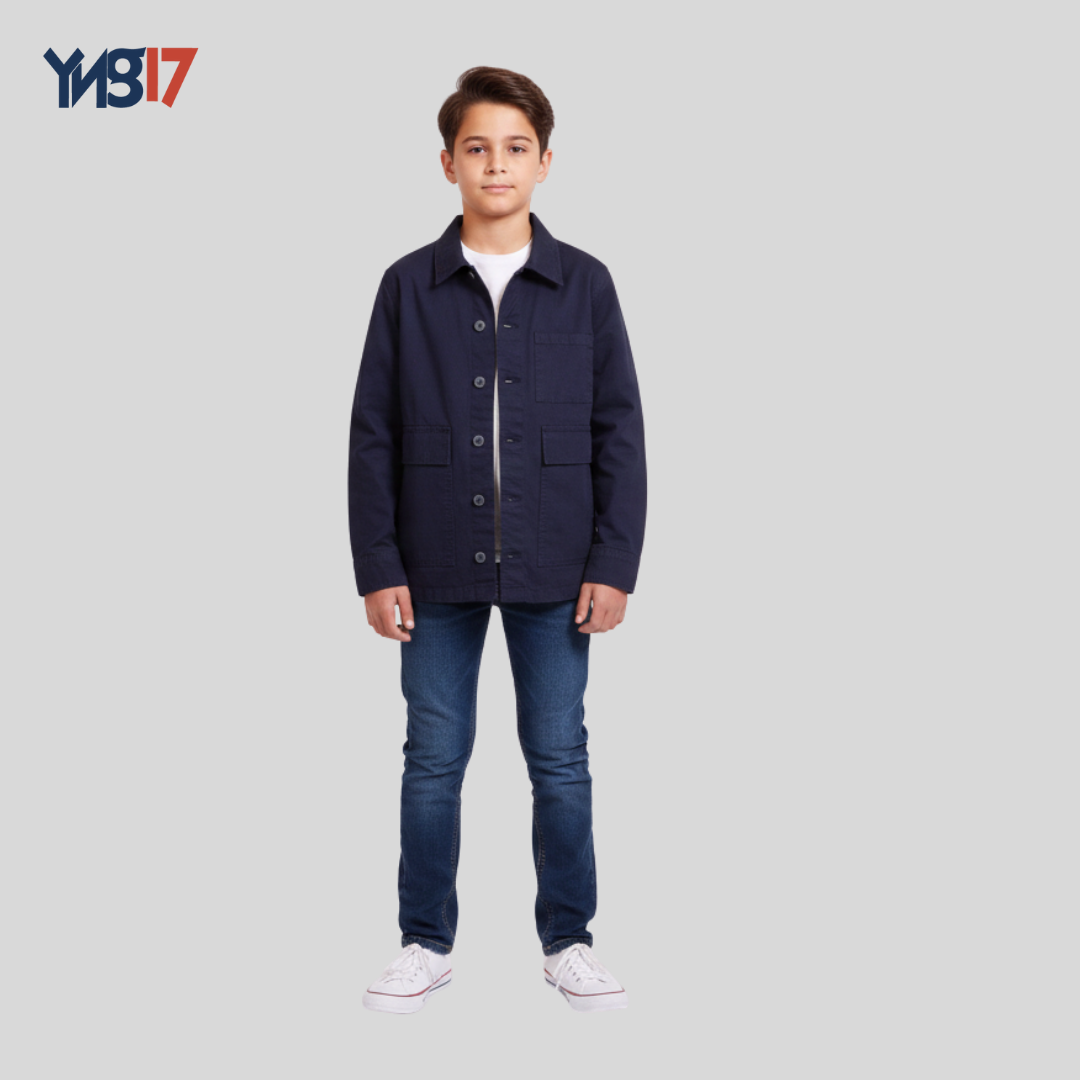 A modern kids utility jacket shirt combining the classic shirt look with light jacket functionality.
